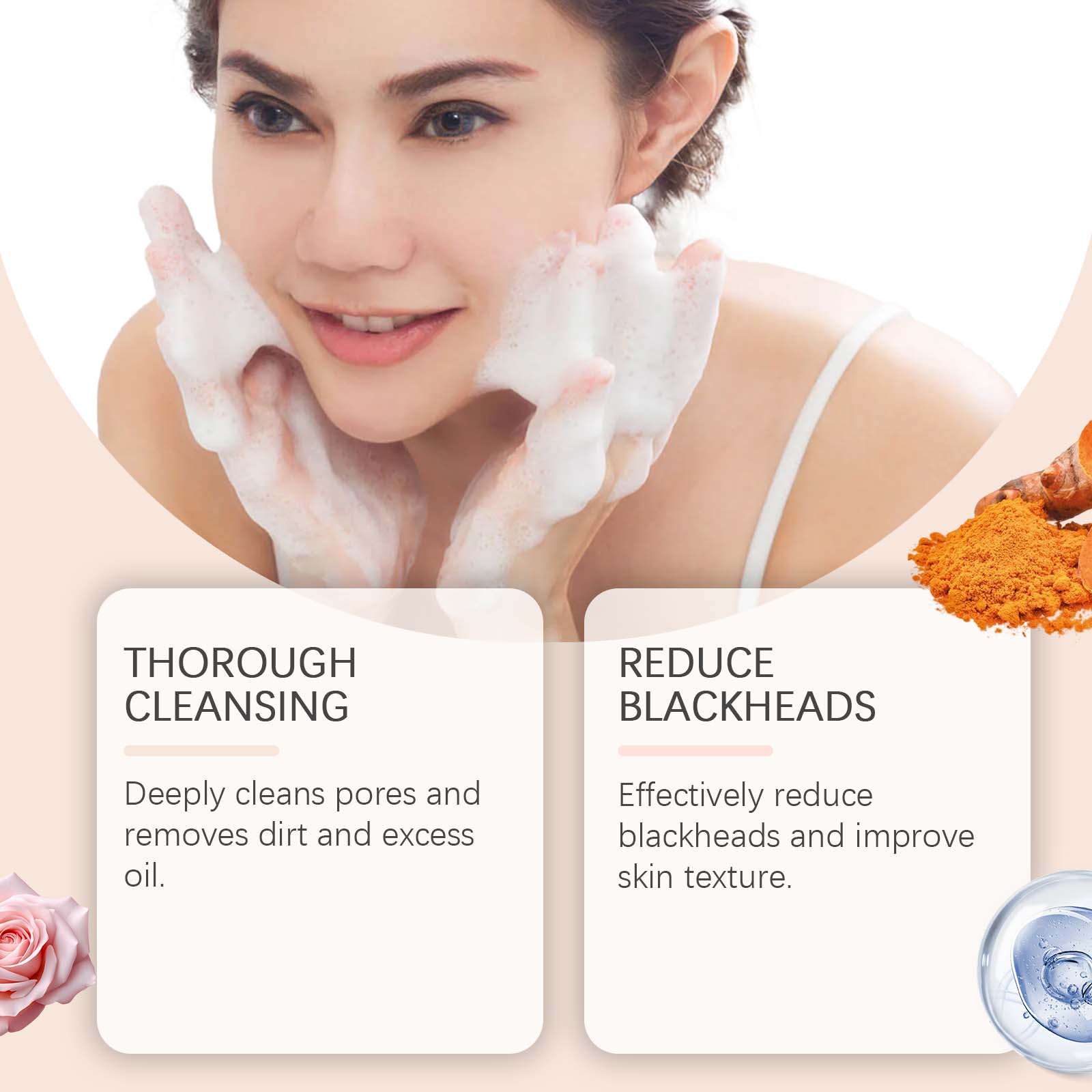 Our Turmeric Tightening Pore Cleanser Contains Kojic Acid, Lemon Extract. It can effectively brighten skin tone and make skin glow radiantly. Its usage method is very simple: first moisturize the facial skin, squeeze out the cleansing foam from the bottle, gently massage, use the brush head to clean the face, and finally rinse thoroughly with warm water. It can also deeply clean pores, remove dirt and excess oil.