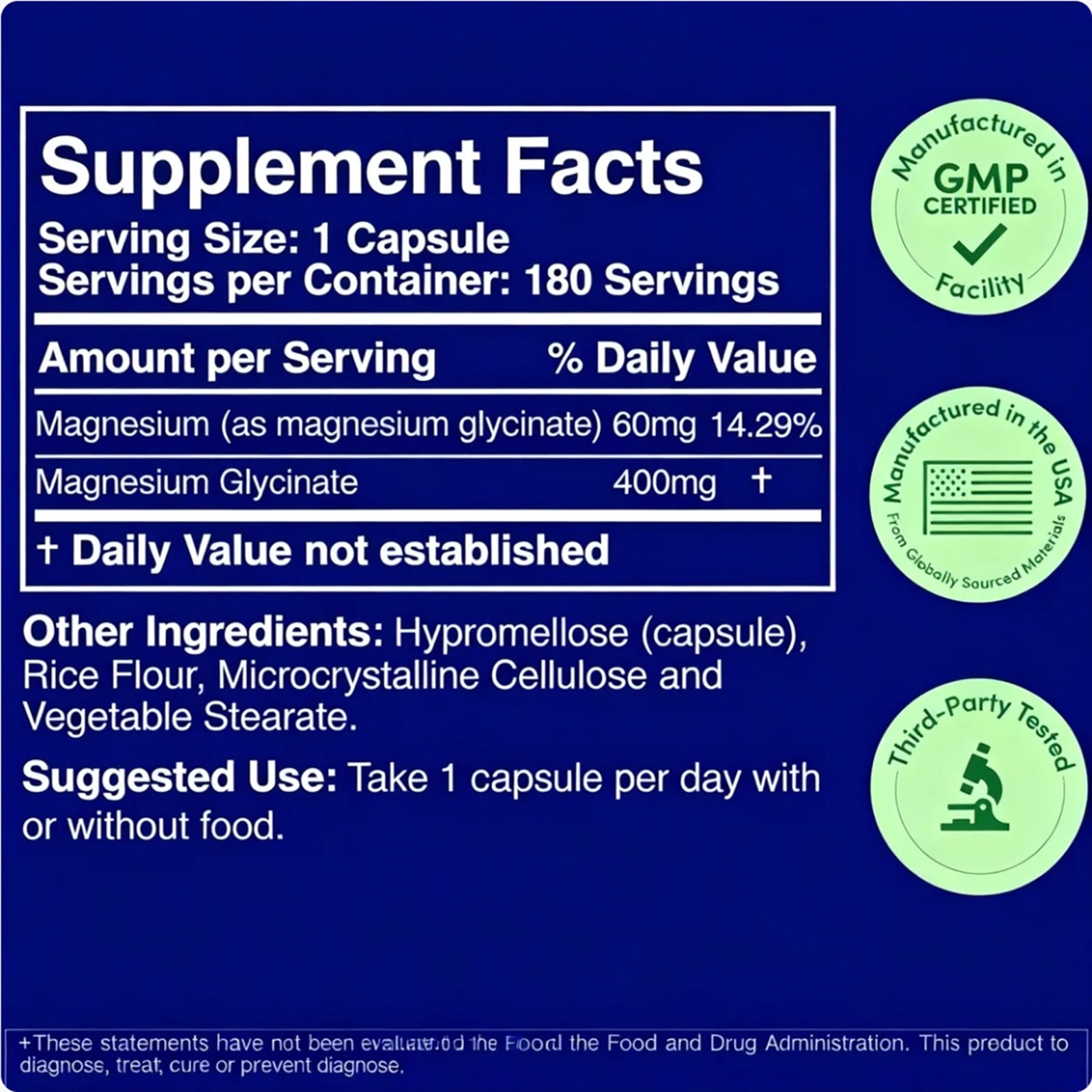 Elke capsule bevat 400 mg hoogwaardig magnesiumglycine, verpakt in een grote verpakking van 180 capsules. Slechts 1 capsule per dag voldoet aan de dagelijkse voedingsbehoeften van een volwassene – een uitstekende prijs-kwaliteitverhouding zonder dat u vaak hoeft bij te vullen.